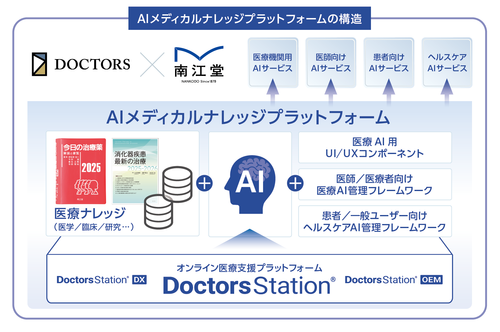 この新しいAIメディカルナレッジプラットフォームは、ドクターズが提供するDoctors Station® OEM及びDoctors Station® DXをベースとし、南江堂がもつ豊富な医学/医療ナレッジとAIを組み合わせ、さまざまなカスタマイズを加え開発します。