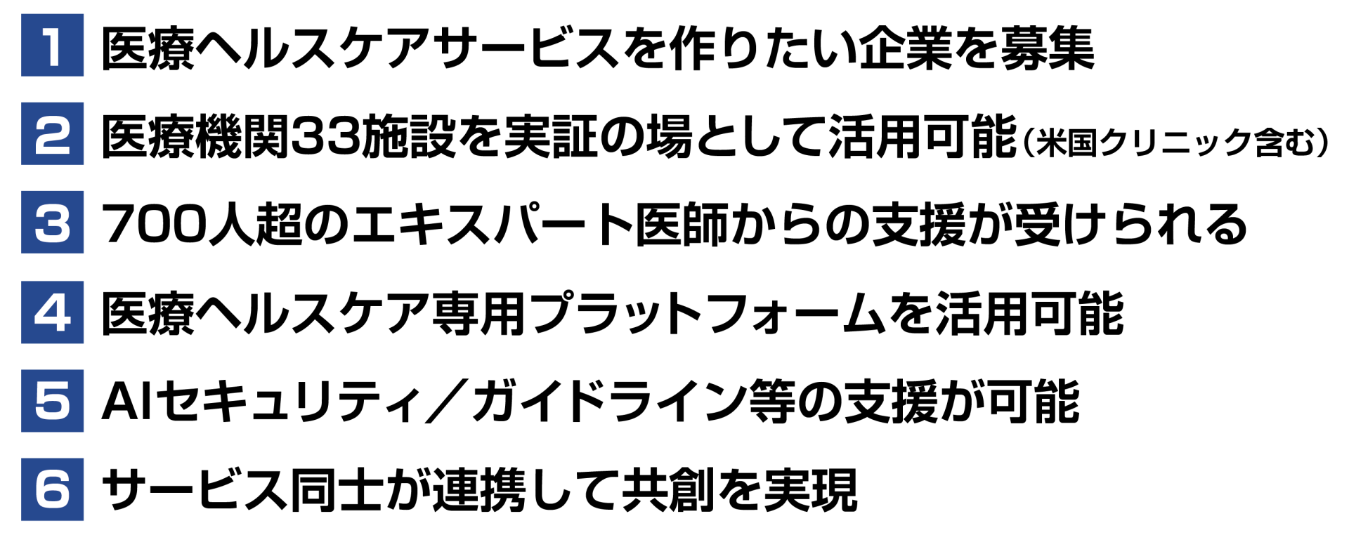 ドクターズは、国内外あわせて33の医療機関を本プロジェクトにおける実証・検証の場として提供し、実際の医療現場でAIサービスを磨き上げていきます。これらの医療機関には日本国内のみならず、アメリカのクリニックも含まれており、グローバル展開を見据えた医療ヘルスケアAIの社会実装が可能です。リアルな医療現場での検証を前提とすることで、「使われるAI」「続くAI」「広がるAI」を生み出していきます。