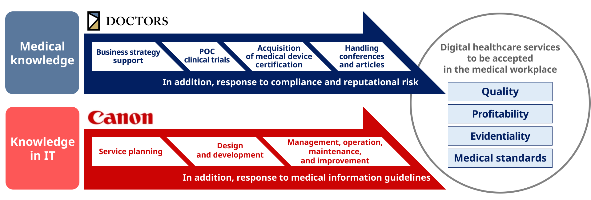 DOCTORS and Canon ITS will contribute to the development of healthcare in Japan by supporting the creation of true digital healthcare services with no divergence from the raw opinions on the medical front through support and activities for companies that are working on digital healthcare arising from our collaboration.