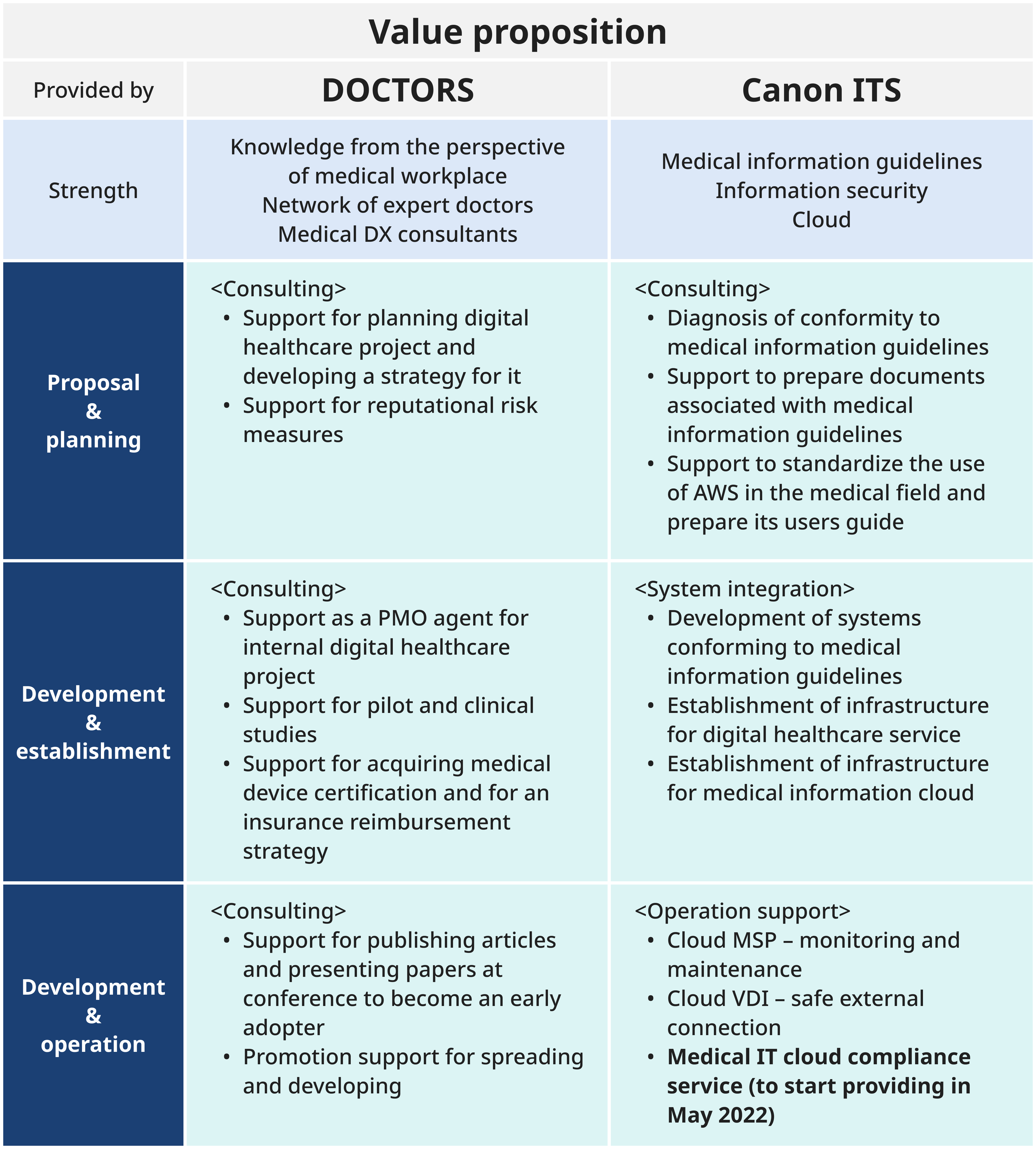 Provided are DOCTORS’ consulting services for planning that includes support for interviews with doctors, healthcare providers, and patients and support for reputational risk measures, as well as Canon ITS’s diagnosis of conformity to medical information guidelines, and support to prepare associated documents. Moreover, including the establishment of infrastructures for digital healthcare service and medical information cloud (by Canon ITS), support for pilot and clinical studies, and for acquiring medical device certification (by DOCTORS), both companies will collectively provide various services that cover the entire medical lifecycle.